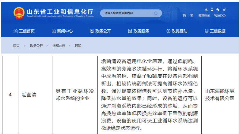 山东海能环境技术有限公司创新节能产品“垢菌清”成功入选山东省经济和信息化委员会公布的《山东省重点节能技术、产品和设备推广目录(第八批)》。这一荣誉标志着海能环境在节能技术领域的**成就和对可持续发展的坚定承诺。
